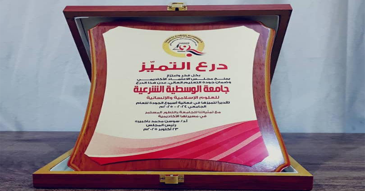 في خطوة مميزة حصلت جامعة الوسطية الشرعية للعلوم الإسلامية والإنسانية على درع التميز في فعالية تقييم أسبوع الجودة على مستوى الجامعات اليمنية للعام الجامعي ٢٠٢٤م - ٢٠٢٥م،