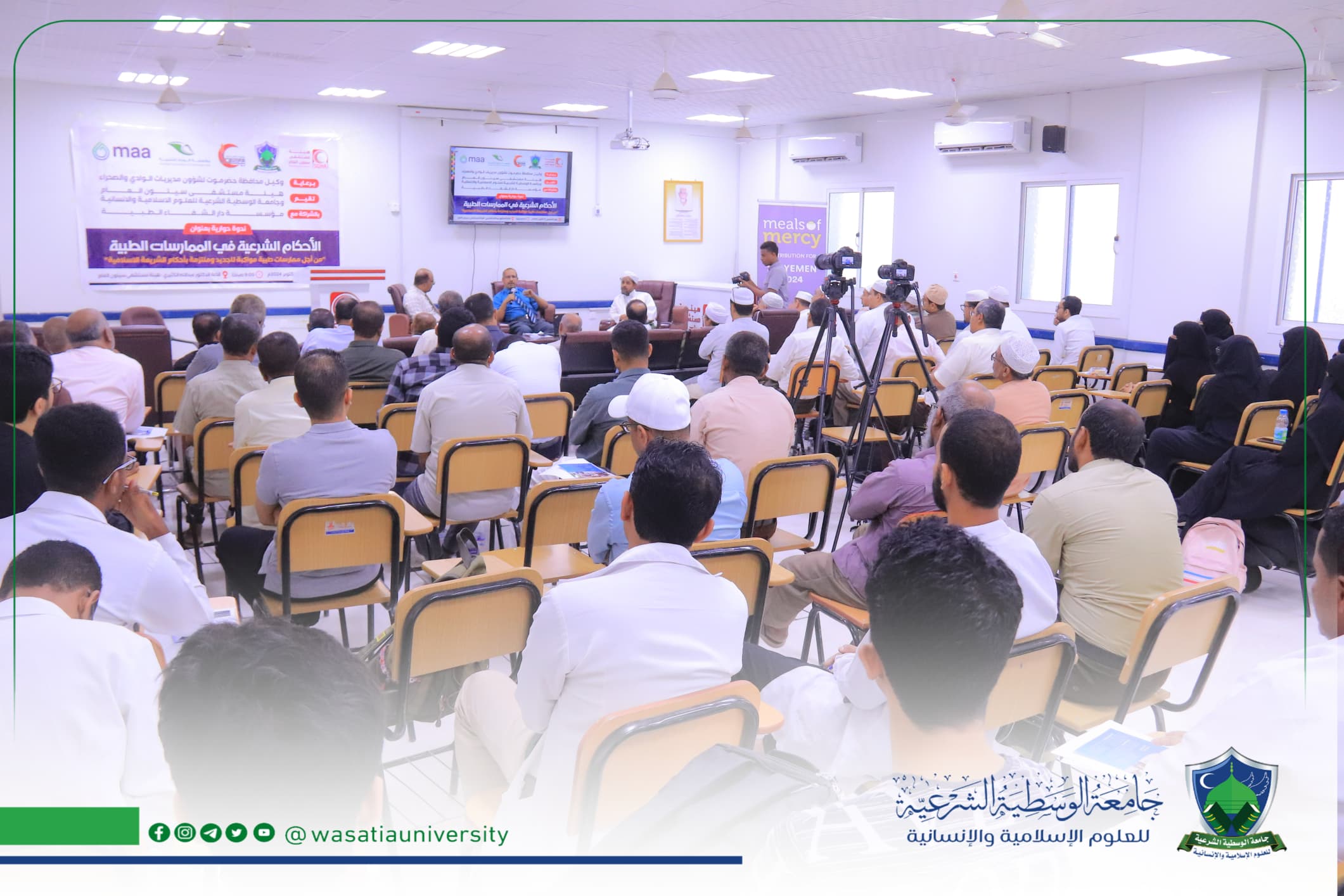 برعاية وكيل محافظة حضرموت لشؤون مديريات الوادي والصحراء الأستاذ عامر سعيد العامري، ومجلس مكتب الموجه العام لأربطة التربية الإسلامية ومراكزها التعليمية والمهنية، أقامت صباح اليوم الخميس ٢٨ ربيع ثاني ١٤٤٦ه الموافق ٣١ أكتوبر ٢٠٢٤م بقاعة الدكتور عبدالله بن جعفر الكثيري بالمبنى الأكاديمي جامعة الوسطية الشرعية وهيئة مستشفى سيئون العام بالتعاون مع مؤسسة دار الشفاء الطبية، ومؤسسة الوداد للتنمية، الندوة العلمية الحوارية الموسومة : ( الأحكام الشرعية في الممارسات الطبية ) تحت شعار : "من أجل ممارسات طبية مواكبة للجديد وملتزمة بأحكام الشريعة الإسلامية" بحضور رئيس جامعة الوسطية الشرعية للعلوم الإسلامية والإنسانية الدكتور عبدالله عبدالقادر العيدروس، ورئيس هيئة مستشفى سيئون العام الدكتور محمد علوي العيدروس ، ورئيس جامعة سيئون الأستاذ الدكتور محمد عاشور الكثيري، ورئيس جامعة القرآن الكريم الأستاذ الدكتور يحيى الصباحي، ورئيس مؤسسة دار الشفاء الطبية عضو اللجنة التحضيرية للندوة الأستاذ فهمي محمد السقاف، ورئيس مؤسسة البلسم الصحية عضو اللجنة العلمية للندوة الشيخ صالح باجرش، وعميد كلية الطب بجامعة سيئون الأستاذ الدكتور حسين أحمد باكثير، ونواب رئيس جامعة الوسطية الشرعية للدراسات العليا والبحث العلمي والجودة الأستاذ الدكتور أحمد محمد السقاف، وللشؤون الأكاديمية الدكتور عبدالرحمن بن علي الحبشي، ولشؤون الطلاب الدكتور حسين بافضل، والأمين العام بالجامعة الأستاذ أحمد السري، وعميد كلية أصول الدين د. حسين السقاف، وممثلي المؤسسات الطبية والتنموية، ونخبة من الدكاترة المختصين والباحثين وطلاب كلية الطب.